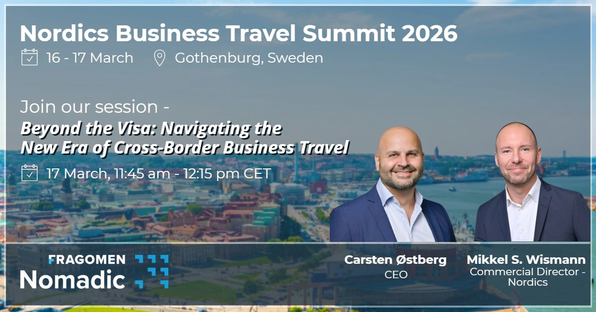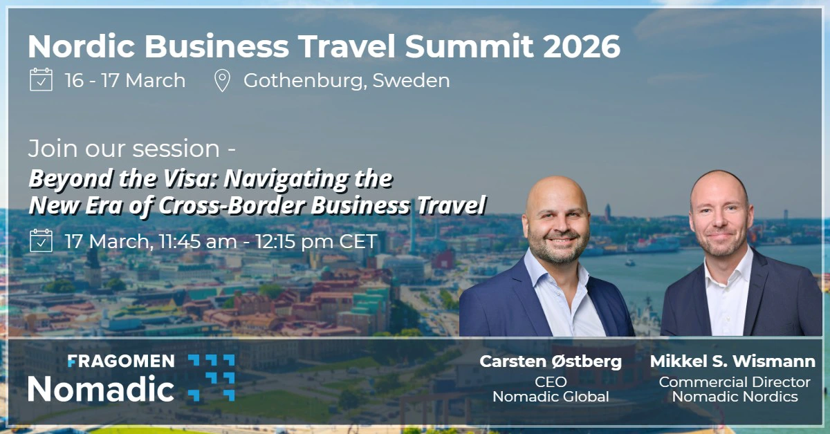 Nomadic CEO, Carsten Østberg, and Commercial Director - Nordics, Mikkel S. Wismann, will present the session Beyond the Visa: Navigating the New Era of Cross-Border Business Travel at NBTS 2026 in Gothenburg, March 16 - 17.